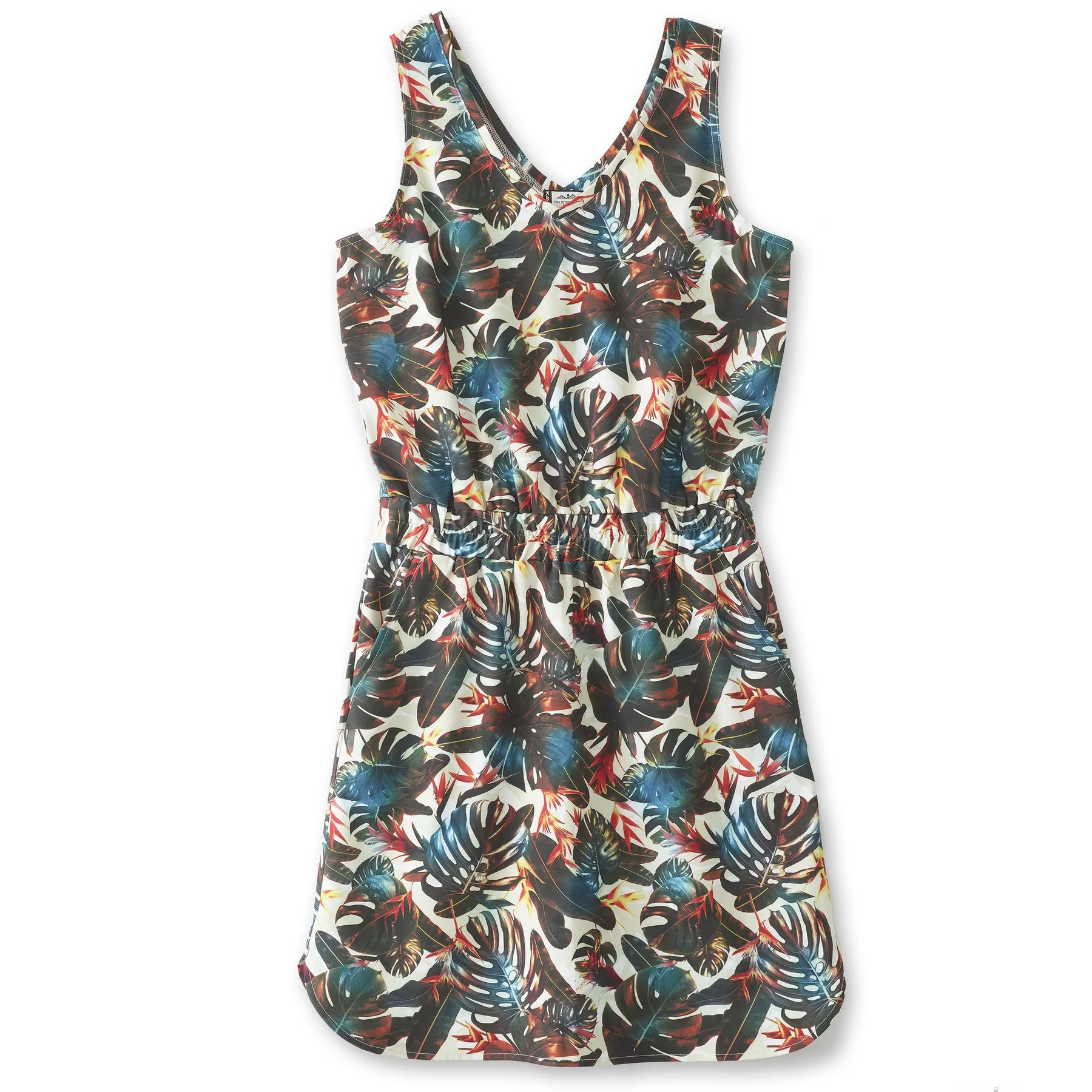 Semi-fitted sleeveless dress, elastic waist, v-neckline, front pockets, curved hem, length hits mid-thigh.