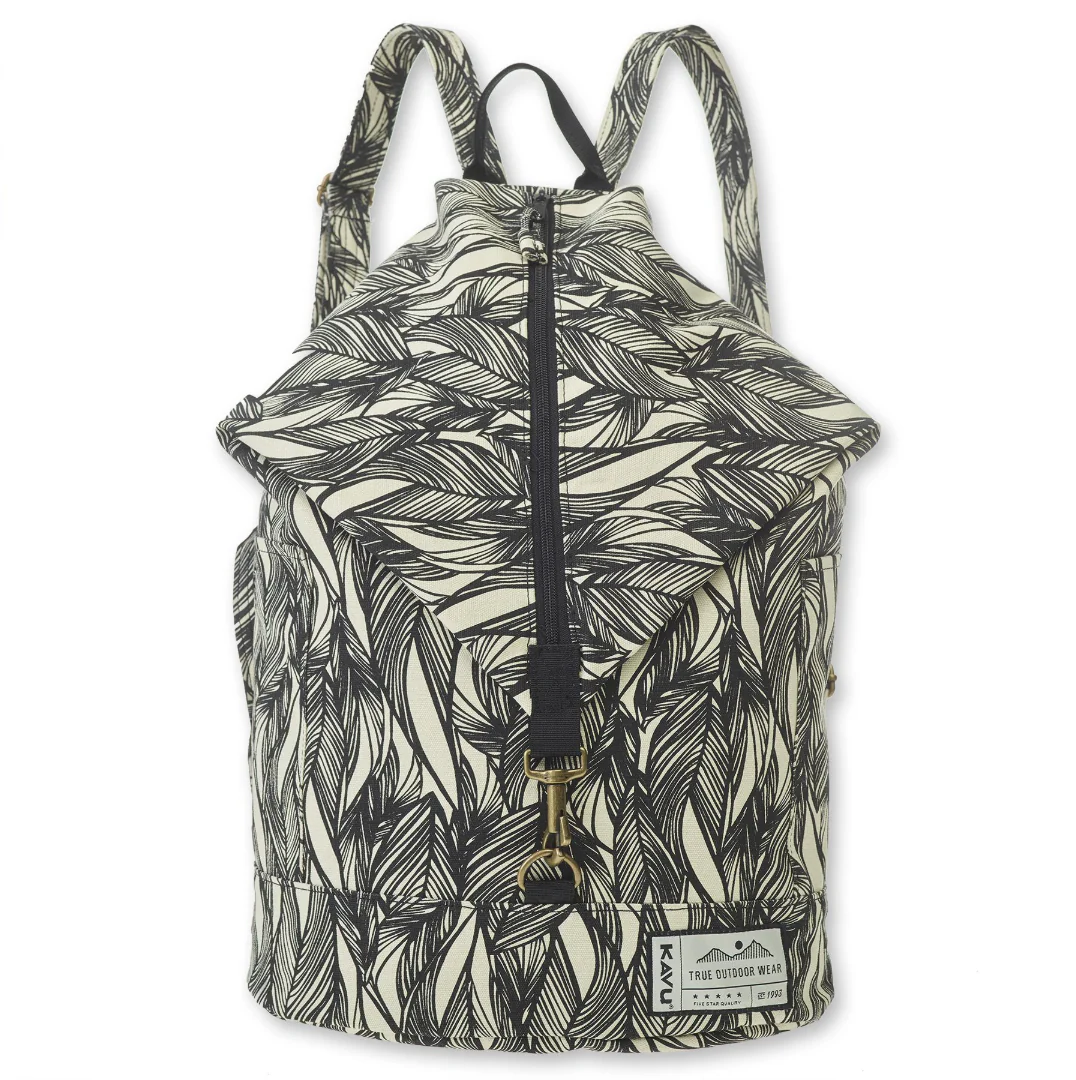 Backpack with adjustable shoulder straps, fixed hand strap, main compartment with zip and hook closure, two exterior side pockets with Velcro closure, interior zip pocket, padded bottom panel, antique brass hardware and faux metal zips with rope loop zip pulls.