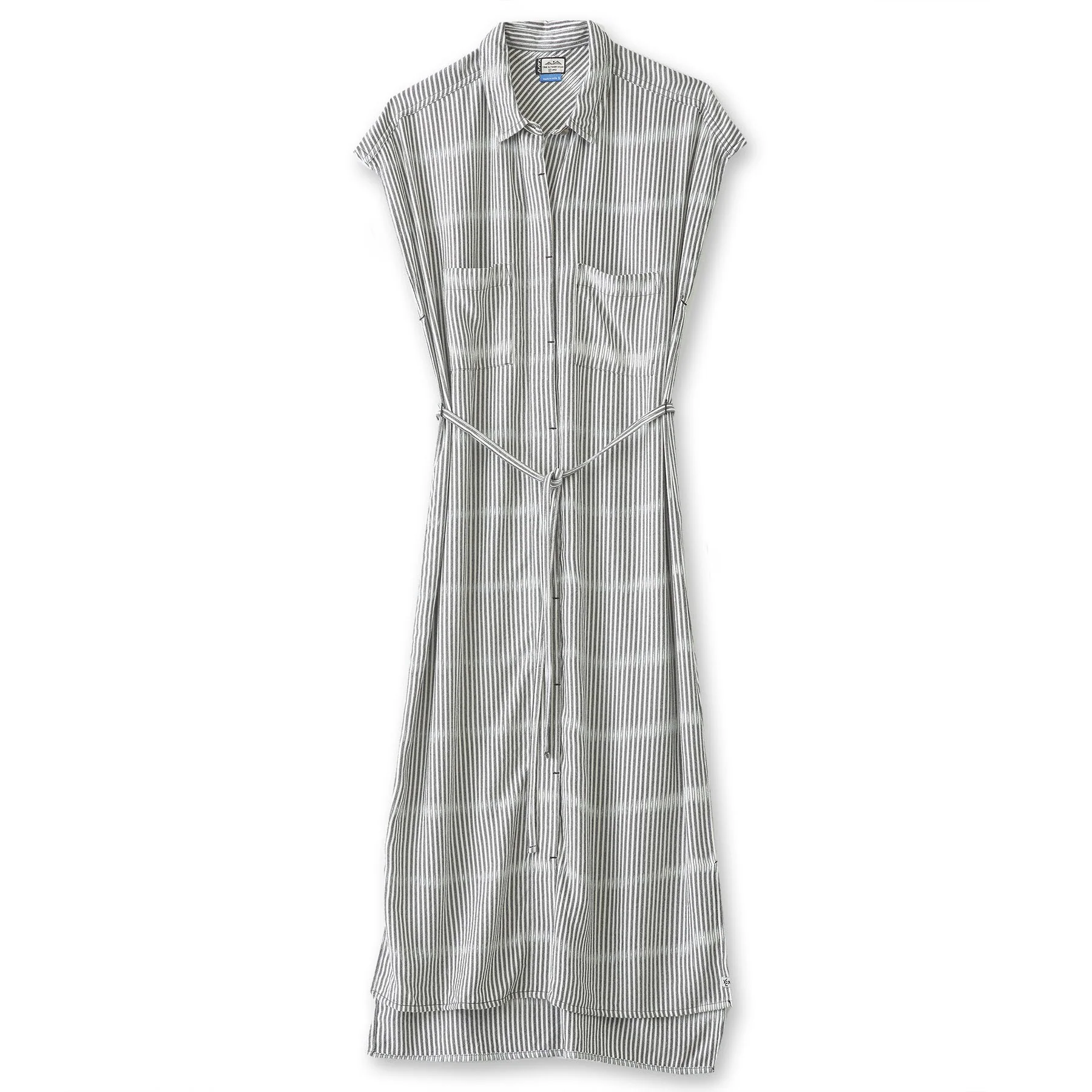 Free flow'n dolman sleeve button up dress, hidden placket, stand collar, two chest pockets, self-fabric waist belt, straight hem with side slits and 3" back hem drop, length hits mid-calf.