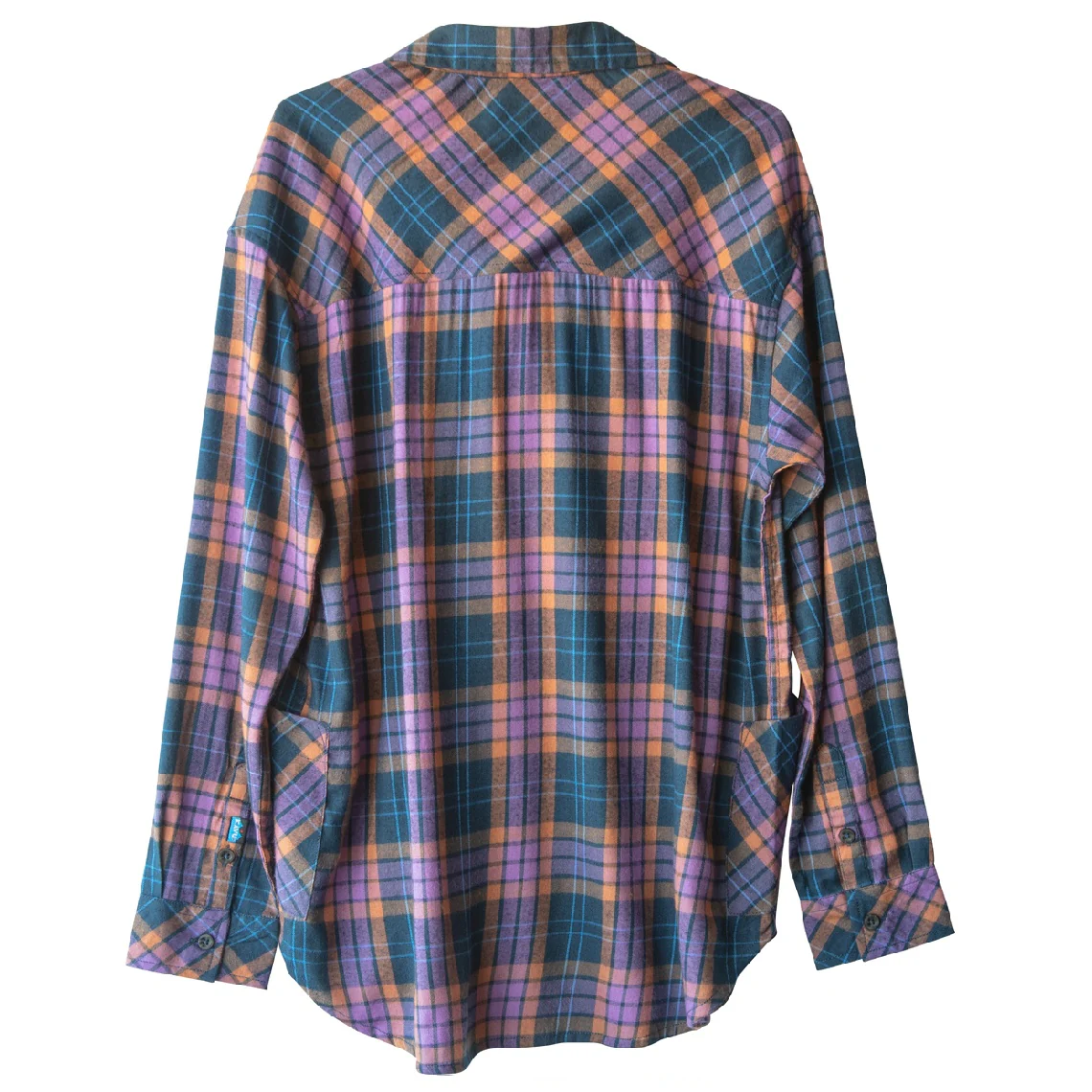 Relaxed fit, long sleeve half placket shirt with hidden buttons, stand collar, lower patch pockets, deep curved hem.