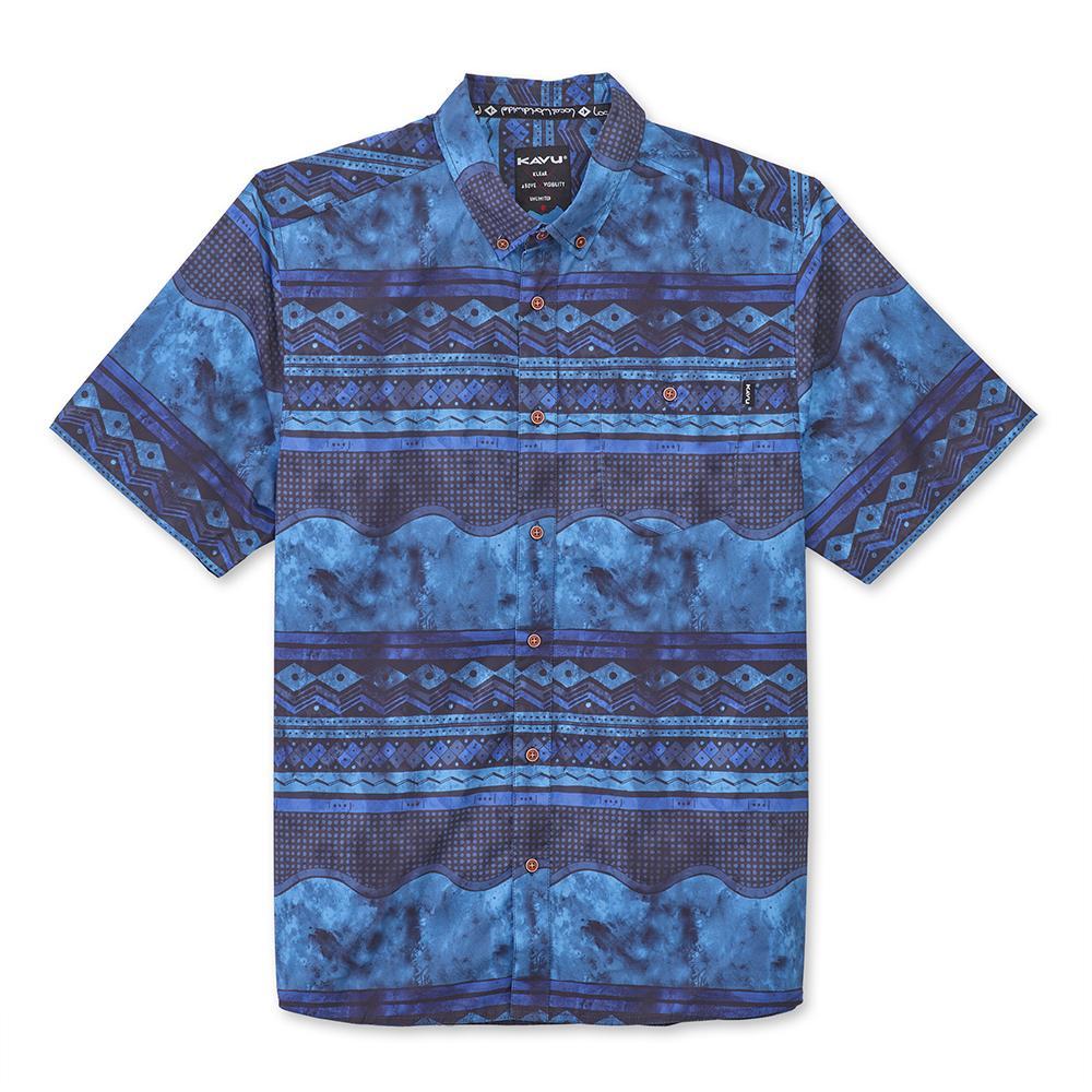 Casual fit, short sleeve button up shirt, button down collar with interior KAVU logo jacquard tape, contrast interior neck band and under placket piecing, single chest pocket with button closure, faux wood buttons, back yoke panel, curved hem.