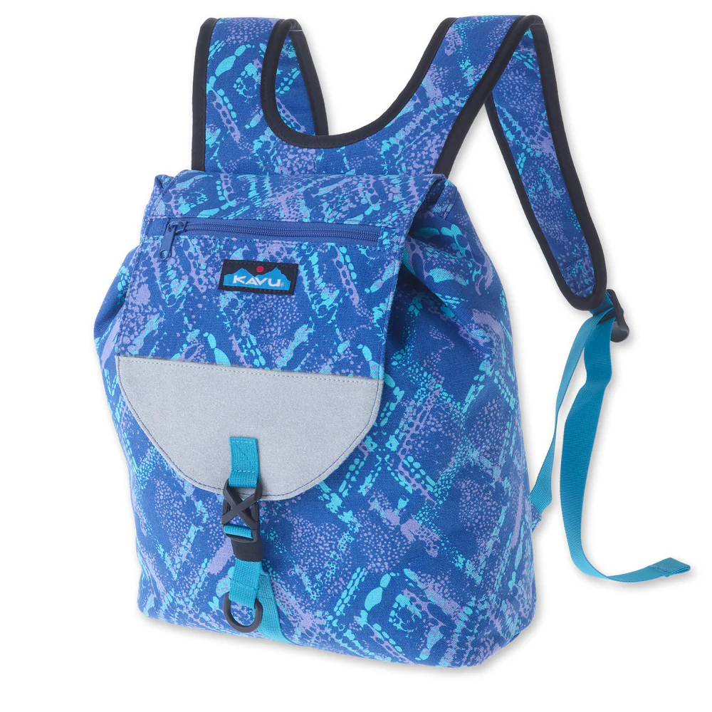 Rucksack with adjustable shoulder straps, main compartment with cord lock cinch and flap closure, one exterior zip pocket on flap, interior zip pocket, padded bottom and back panel with KAVU embroidery, synthetic suede accent on flap.